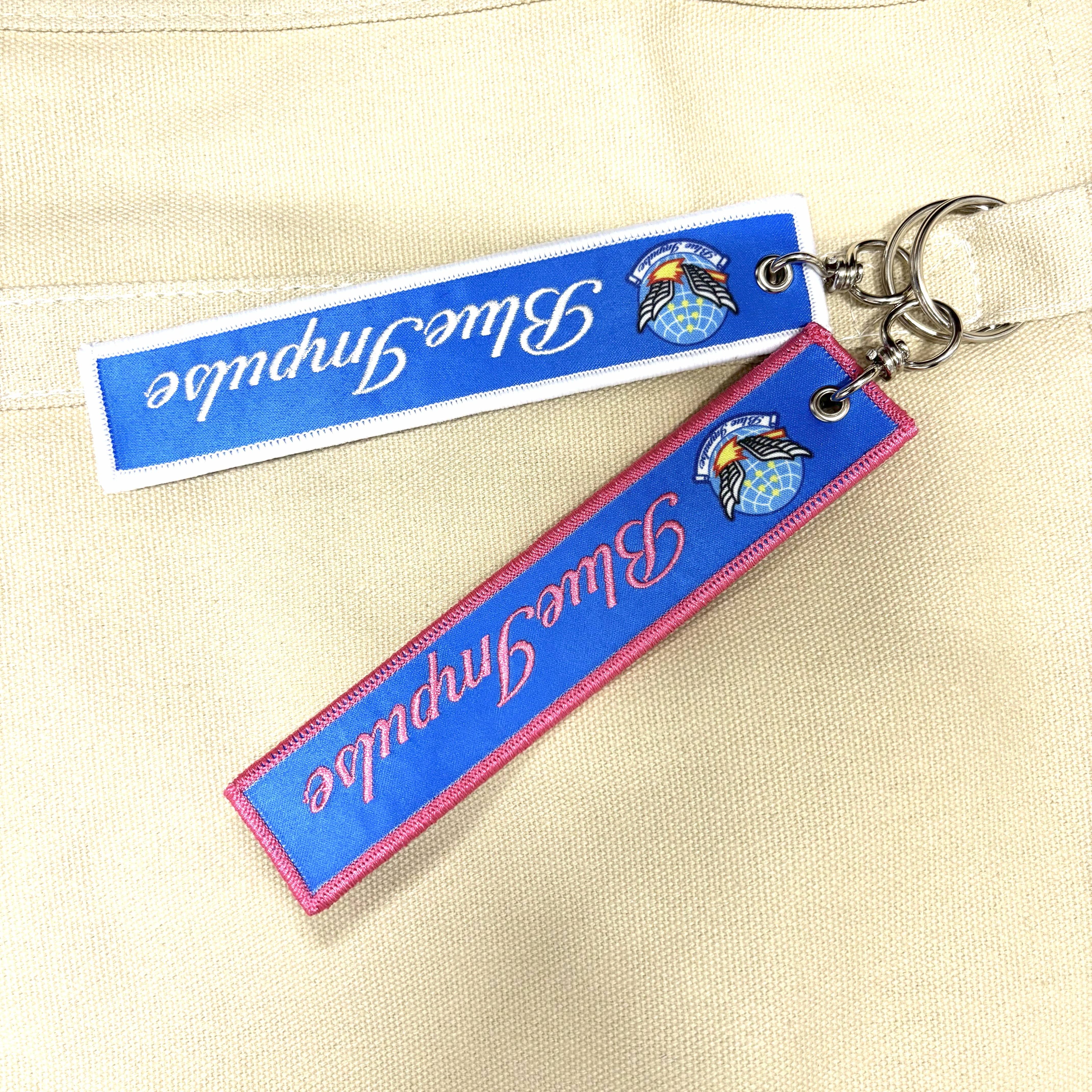ブルーインパルスのロゴとエンブレムが描かれた刺繍キーチェーン。
